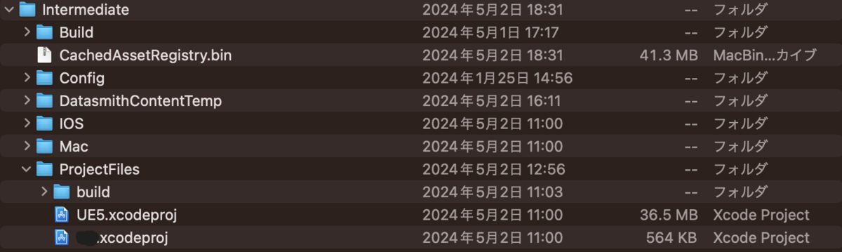 UE5と[Project名]の.xcodeprojが出来ているのを確認